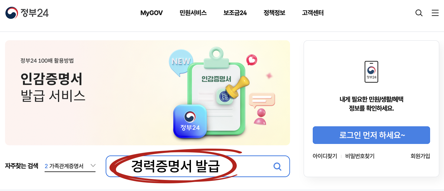 3. 검색창에 "경력증명서 발급"을 검색합니다.