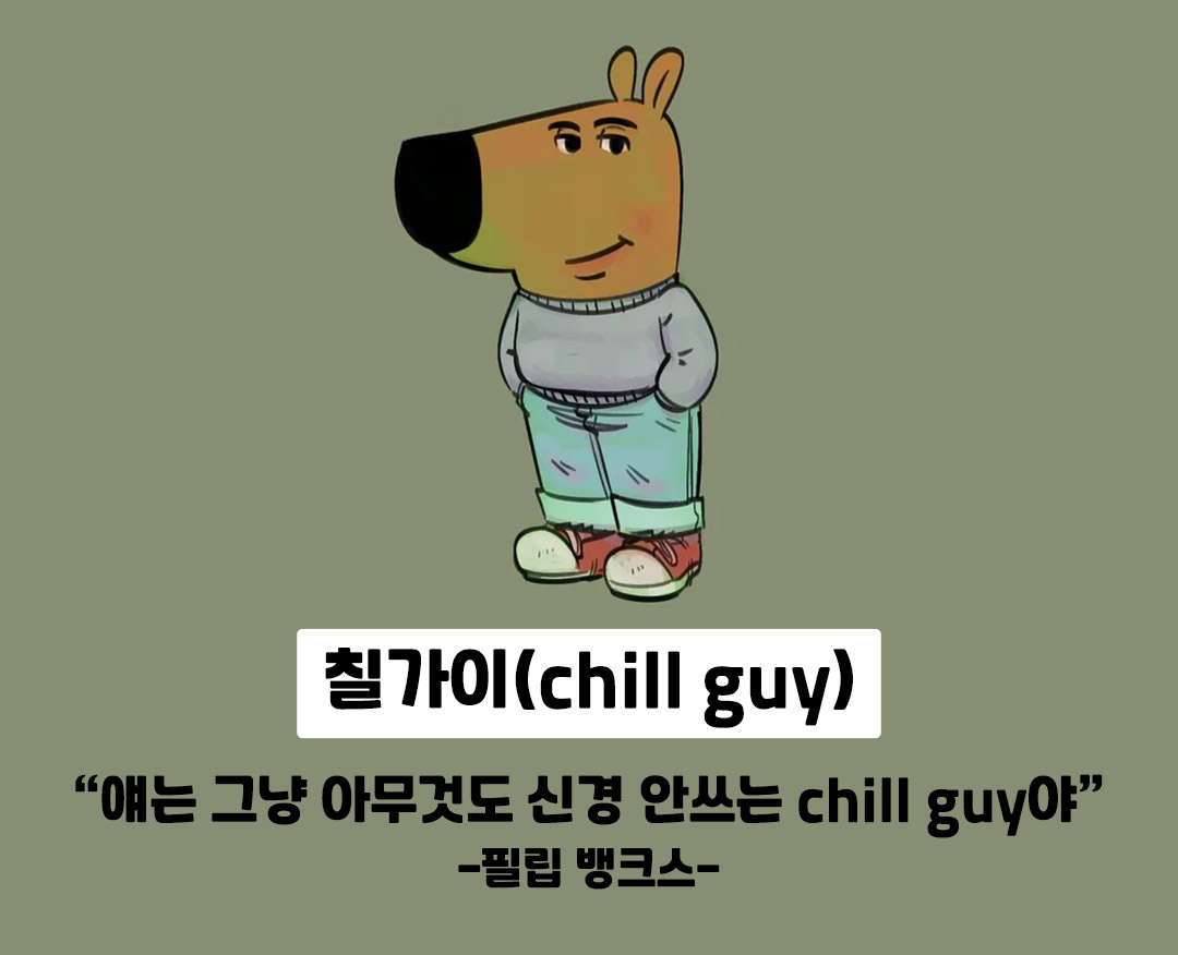 칠 가 이(chill guy)는, "편안하고 긴장하지 않으면서 쉽게 화내거나 스트레스받지 않는 성격"을 가진 사람들을 묘사할 때 쓰고 있습니다.